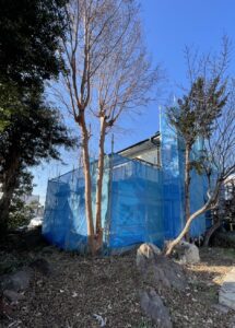 外壁塗装やメンテナンスを行う職人さんが安全に作業できるよう、建全体をしっかりと囲いました。