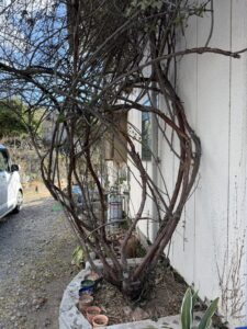 壁面に沿って複雑に伸びていたツル薔薇を、スッキリと整えました。