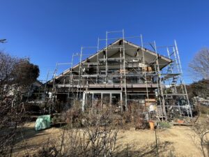 こちらの写真をご覧ください。雲ひとつない冬晴れの下、立派な建物にガッチリと足場を組み上げました。